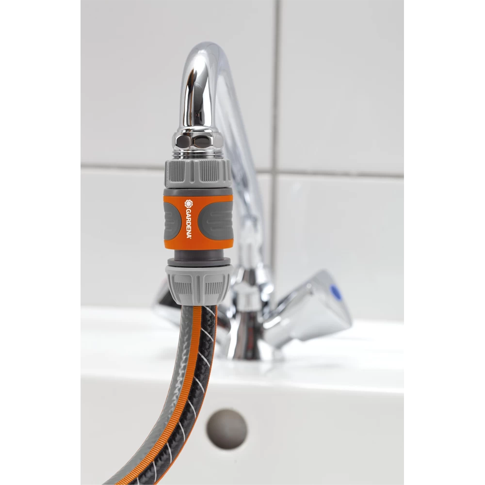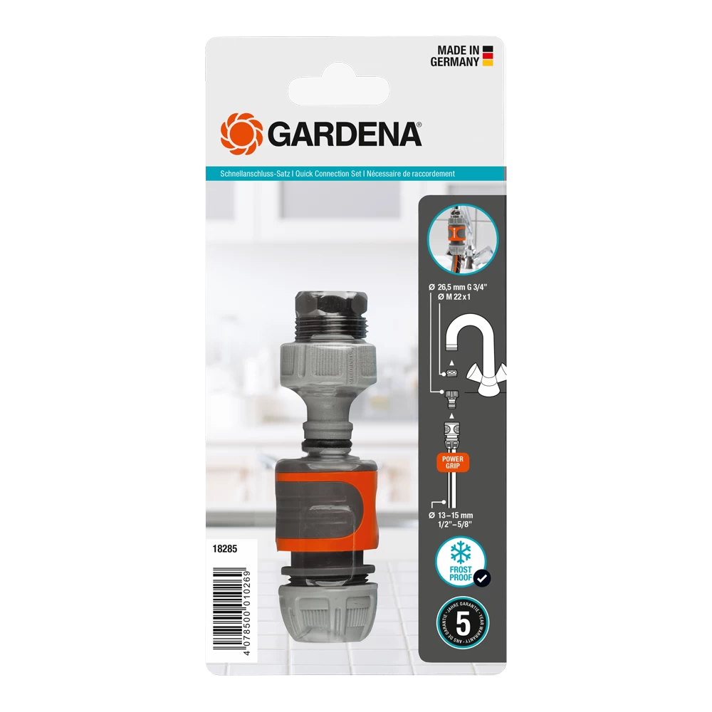 De GARDENA System set snelaansluitstukken bestaat uit een GARDENA kraanstuk (Art.nr. 18201), een slangstuk (Art.nr. 18215) en een draadadapter (Art.nr. 2906). Deze set maakt een snelle verbinding mogelijk tussen een kraan met bruiskop (bijv. in keuken of badkamer) en de tuinslang.