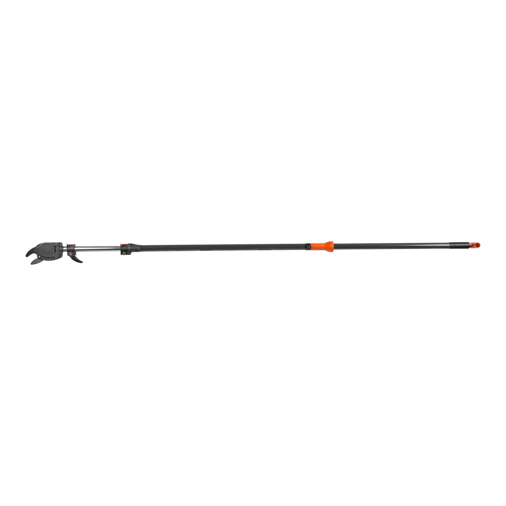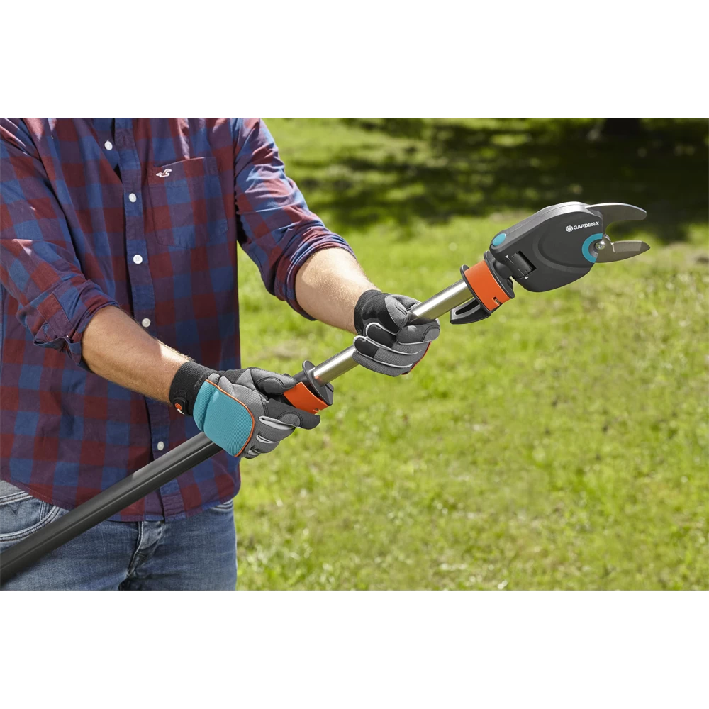 De nieuwe GARDENA telescopische boom- en takkenschaar StarCut 410 plus is de specialist voor het onderhoud van hoge bomen en struiken. Hij heeft een telescopische aluminium steel die traploos kan worden versteld van 230 tot 410 cm. Dit maakt de GARDENA Telescopische StarCut 410 plus nog flexibeler in gebruik en biedt een bereik van maximaal 6,5 m, inclusief de lengte van de gebruiker. De 12-voudige transmissie zorgt voor krachtig snoeien van takken met een diameter tot 32 mm. De nieuwe verstelbare haak voor het verwijderen van afgesneden takken zorgt voor extra comfort tijdens boomonderhoud. Hiermee kunt u gezaagde takken zonder problemen van de kronen van bomen verwijderen. De GARDENA Telescopische StarCut 410 plus heeft een intern mechanisme voor katroloverbrenging dat voorkomt dat het tijdens het snoeien in takken blijft haken. De extra lichte en slanke snijkop maakt handig en gericht snijden zelfs in de buurt van de kofferbak mogelijk. De snijhoek kan individueel vanaf de grond worden aangepast. De precisiegeslepen, niet-klevende messen verminderen de weerstand bij het zagen en garanderen een eenvoudige reiniging. De trekhuls met de slipstop en een extra T-hendel zorgen voor een aangename en veilige bediening. De GARDENA Telescopische StarCut 410 plus is ‘Made in Germany’.