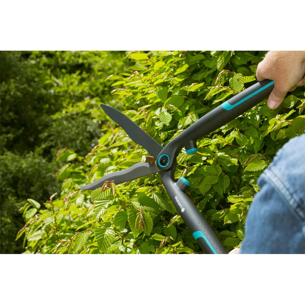 Als u uw heg comfortabel en uiterst efficiënt wilt snoeien, komt de EasyCut van GARDENA zeker van pas. De hoge standaard van de schaar wordt bevestigd door de hoge kwaliteit. U ervaart de kwaliteit zodra u de heggenschaar oppakt. De ErgoTec handgrepen liggen perfect in uw handen dankzij hun uitgebalanceerde vorm en geweldige ergonomie. Bovendien heeft de heggenschaar een zachte buffer, die voor goede demping zorgt en bijdraagt ​​aan het comfort. U zult onder de indruk zijn van het lage gewicht van de schaar, die wordt bereikt door het gebruik van zeer duurzaam vezelversterkt kunststof. De kunststof handgrepen bieden een stevige houvast zodat elke snede telt. Door de combinatie van al deze functies kunt u langer werken zonder moe te worden. De innovatief ontworpen gekartelde rand van de messen voorkomt dat takken of twijgen van de messen wegglippen. De gekartelde rand zorgt voor bijzonder veel efficiëntie, vooral bij het werken op grotere oppervlakken. De EasyCut is een echte alleskunner, ongeacht of u uw heg snoeit, de bladeren van een struik snoeit of een tak snijdt.