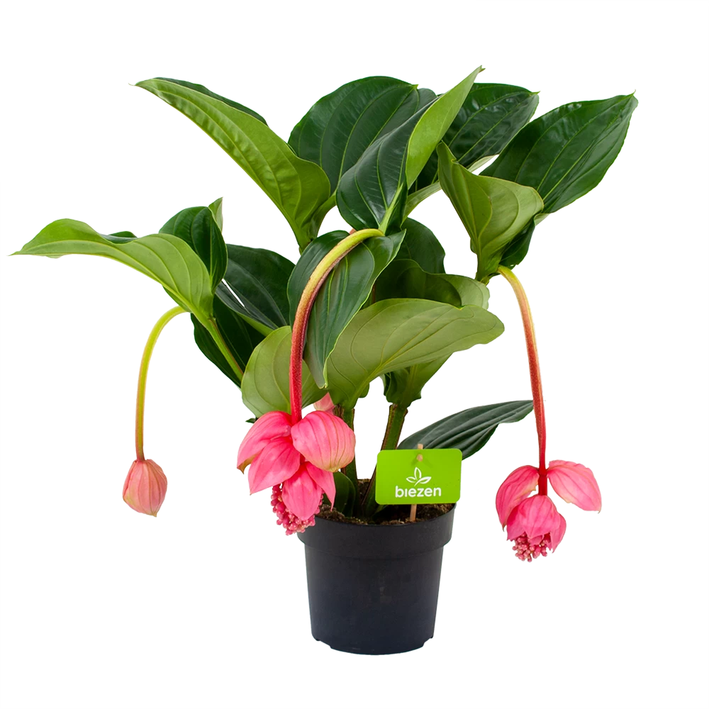 Schrik niet: de bloemen van deze kamerplant horen te hangen. Binnenin groeien trossen kleine bloemetjes en daaromheen groeien de grote schutbladeren van de bloem, vandaar dat de Medinilla Magnifica ook wel Trosbloem wordt genoemd. Plaats de plant op een lichte plek met indirect zonlicht zo’n 2 meter van het raam. Geef de Trosbloem regelmatig water. Toch een keer vergeten? Dat is voor deze plant geen probleem.