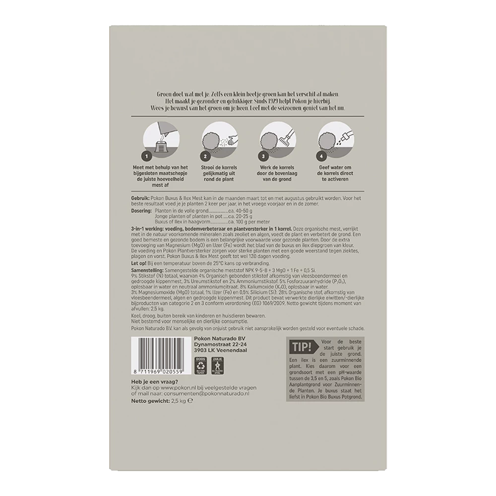 | Dosis | Planten in volle grond: ca. 40-50g. Jonge planten of planten in pot: ca. 20-25g. Buxus of Ilex in haagvorm: ca. 100g per meter. |
