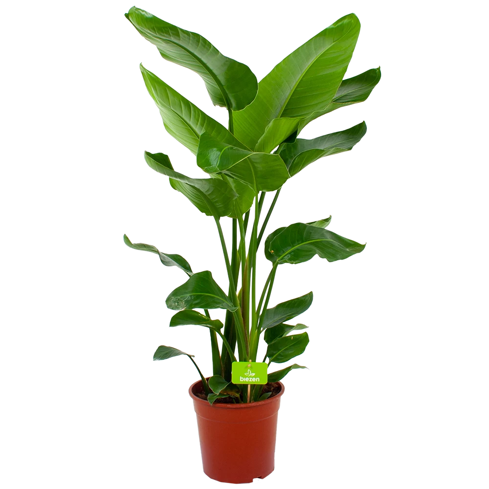 Creëer een tropische sfeer in huis met de prachtige Strelitzia Nicolai. Deze grote groene plant heeft veerachtige bladeren met af en toe wat kleine scheuren. De vorm en kleur van zijn bijzondere bloemen hebben hem de leuke bijnaam Paradijsvogelplant opgeleverd. Plaats de plant op een lichte plek uiterlijk zo’n 2 meter van het raam. Geef de Paradijsvogelplant 1 keer per week ruim water en houd de grond tussen de waterbeurten door licht vochtig.