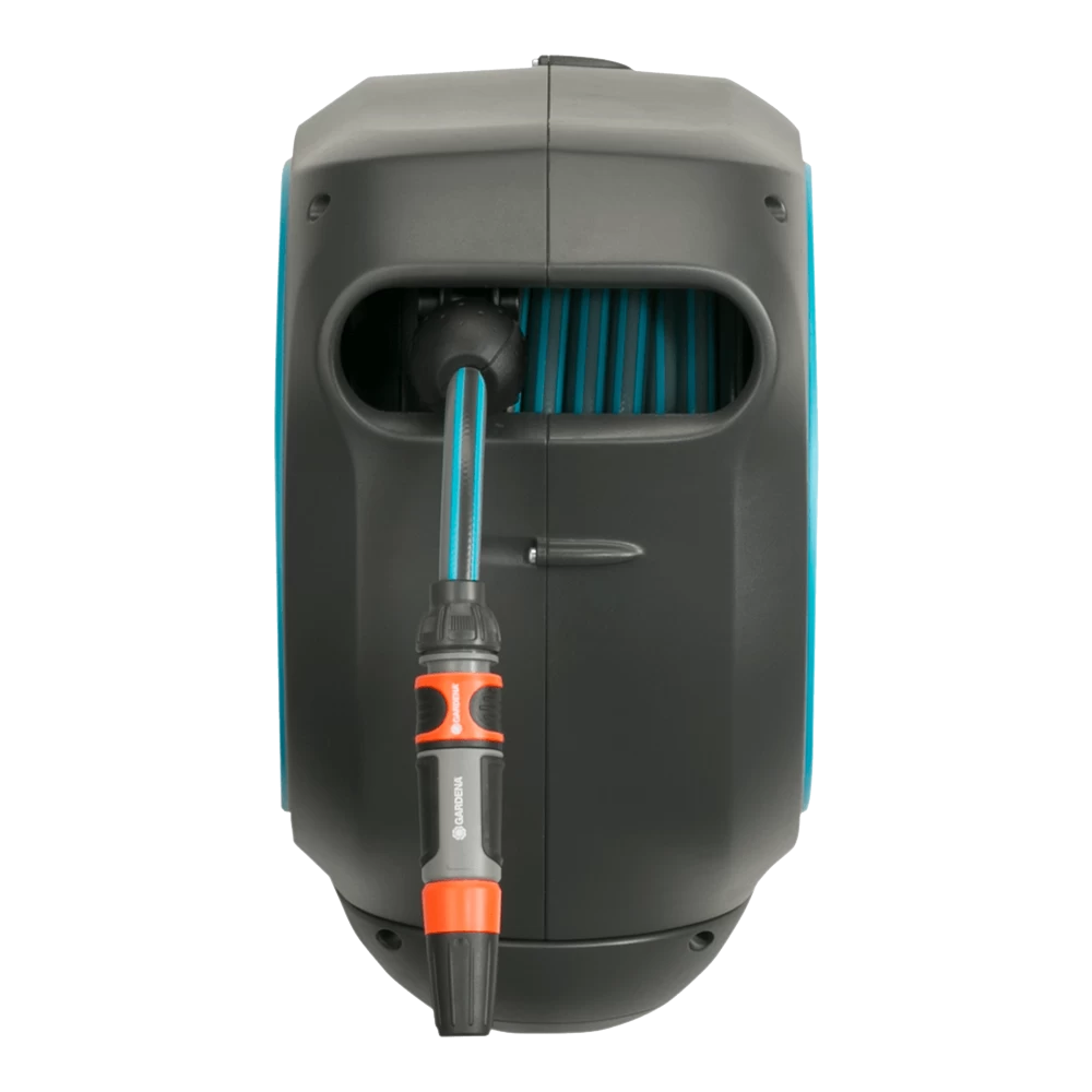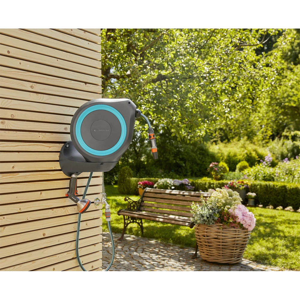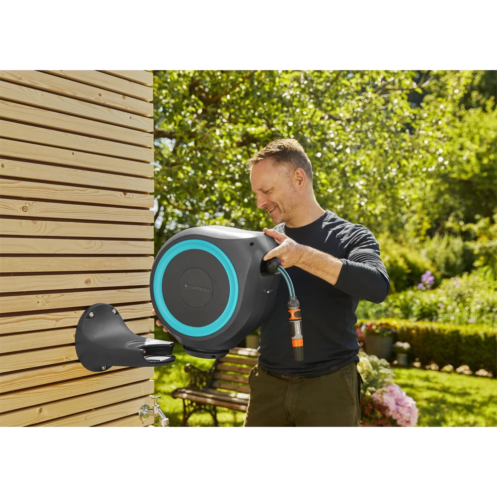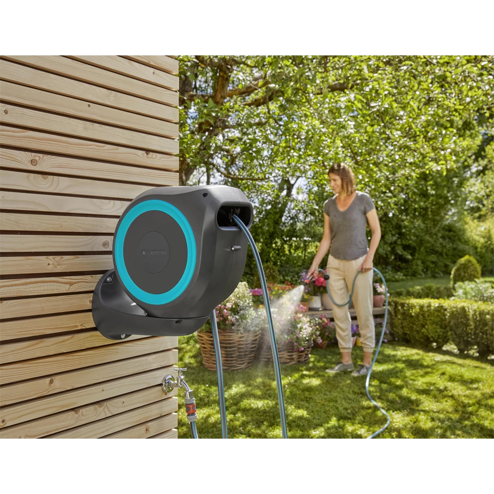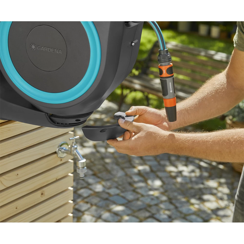 Tuinieren is handiger en gemakkelijker dan ooit met de wandslangenbox RollUp S. Deze helpt uw tuin netjes en opgeruimd te houden en voorkomt hinderlijk struikelgevaar als gevolg van een rondslingerende slang. De praktische slangopslag is eenvoudig aan de muur van uw huis te bevestigen en wordt met een flexibele aansluitslang aangesloten op de kraan. Dankzij de stevige muurbeugel kan de slangenbox meer dan 180 graden worden gedraaid, zodat u elke hoek van uw tuin moeiteloos kunt bereiken. Voor direct gebruik kunt u de tuinslang eenvoudig verlengen tot een lengte van maximaal 15 meter. De tuinslang wordt automatisch in heel korte intervallen vergrendeld zodra u stopt, wat betekent dat de slang eenvoudig en gemakkelijk te hanteren is. Door lichtjes aan het uiteinde van de slang te trekken, wordt de vergrendeling ontgrendeld en een ingebouwde stalen veer met innovatieve RollControl-technologie zorgt voor soepel en gecontroleerd oprollen. De RollControl beschermt de slangenbox en de omgeving tegen schade als gevolg van het te snel inrollen. Om knikken of knopen in de slang te voorkomen, heeft de box een geïntegreerde slanggeleider. Dankzij de slang- en kraanaansluitingen van het Original GARDENA System kunt u eenvoudig en flexibel een verlengstuk of ander compatibel GARDENA element op de slang aansluiten. U hebt altijd uw GARDENA slangopzetstukken bij de hand. Ze kunnen onder de muurbeugel worden bevestigd en daar worden opgeborgen om ruimte te besparen. De GARDENA wandslangenbox is UV- en vorstbestendig en kan het hele jaar door probleemloos aan de muur van het huis blijven bevestigd. Het hoogwaardige materiaal biedt u een lange levensduur en gebruiksgemak zonder onderhoud. Bovendien kan de box niet worden gestolen dankzij de antidiefstalbeveiliging en kan de box alleen door u van de muur worden verwijderd. Samen met de wandslangenbox ontvangt u een muurbeugel, een flexibele aansluitslang, alle benodigde Original GARDENA System en montageonderdelen en een mondstuk met twee verschillende sproeiopties. Bewatering die altijd gebruiksklaar is , dankzij de GARDENA wandslangenbox RollUp S.