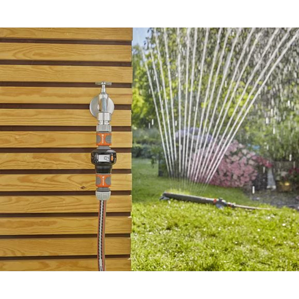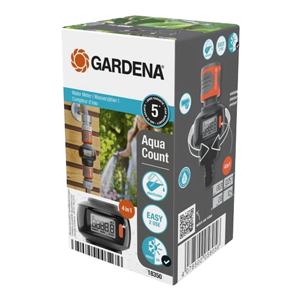De Watermeter AquaCount van GARDENA is een grote hulp wanneer u uw tuin sproeit; hij meet voor u uw eigen waterverbruik en helpt duurzaam water te besparen. Dankzij de meegeleverde batterij is de watermeter direct klaar voor gebruik. Hij kan aan de kraan worden bevestigd, of direct op het uiteinde van de slang in een horizontale of verticale positie. De grote draaibare display is in iedere positie gemakkelijk af te lezen en biedt u 4 functies met nuttige informatie over uw watermanagement Met functies 1 en 2 kan het totale waterverbruik, bijvoorbeeld per dag en per seizoen, afzonderlijk worden weergegeven. Functie 3 toont u het exacte waterverbruik per sproeicyclus en functie 4 geeft u inzicht in de stroomsnelheid in liters of gallons per minuut. De Watermeter AquaCount is gemakkelijk te reinigen, en uv- en vorstbestendig. Dankzij deze duurzaamheid is de watermeter het hele jaar door in de tuin te gebruiken. Deze hoogwaardige productkwaliteit wordt door GARDENA ondersteund met een fabrieksgarantie van 5 jaar. AquaCount: Met afgemeten zorg uw tuin bewateren
